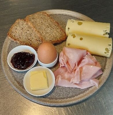 German Breakfast: Vollkorn bread, boiled egg, ham, Swiss cheese, jam and butter