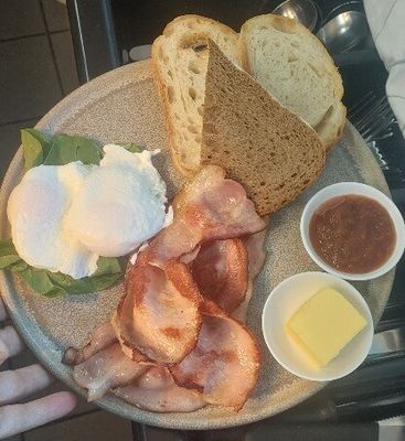 Bacon and poached eggs on spinach, sourdough, spicy tomato relish and butter