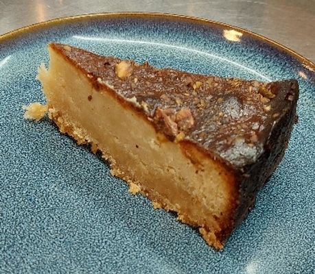 Fresh, thinly sliced apples on a cream cheese filling topped with flaked almonds and cinnamon in a shortcrust case