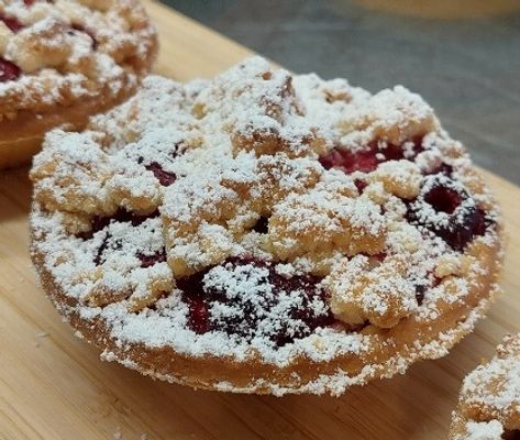 Raspberries on a cream cheese filling topped with crumbles in a shortcrust case