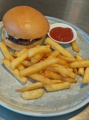 Beef and parmesan patty, melted cheese, chips and tomato sauce
