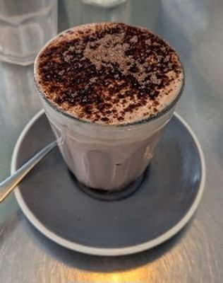 Coffee, chocolate powder, milk, ice cubes