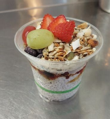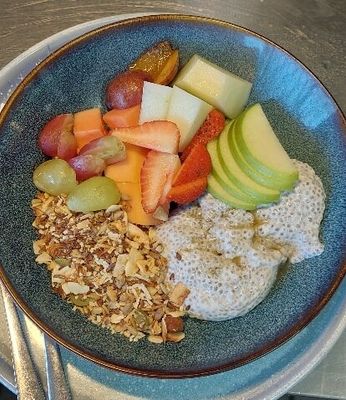 Chia pudding, fruit, Brookfarm granola and Canadian maple syrup GF VEGAN