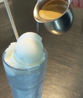 Fresh black coffee poured over ice and vanilla ice cream