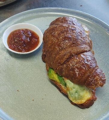 Avocado and melted cheese croissant with a side of spicey tomato relish