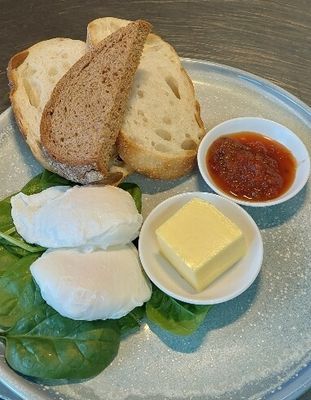 Poached eggs on spinach, sourdough, spicy tomato relish and butter