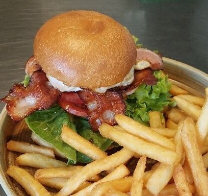 Bacon, fried egg, tomatos and lettuce, served with chips