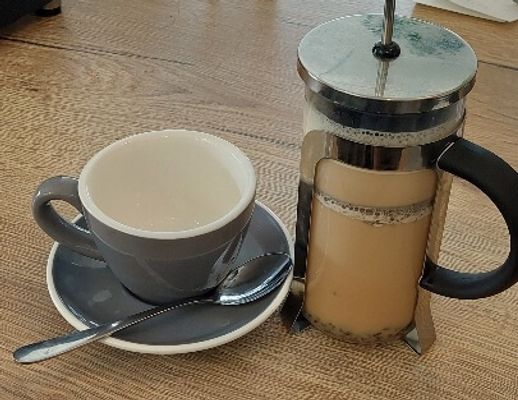 made with Planet Organic chai tea leaves, honey, topped with frothy milk in a plunger