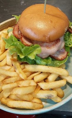 Beef and parmesan patty, lettuce, tomato, beetroot relish, chive mayo and chips