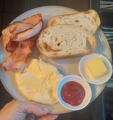 Bacon and scrambled eggs, toast and tomato sauce
