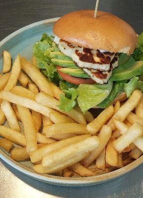 Haloumi, lettuce, avocado, tomato, chilli mayo and chips