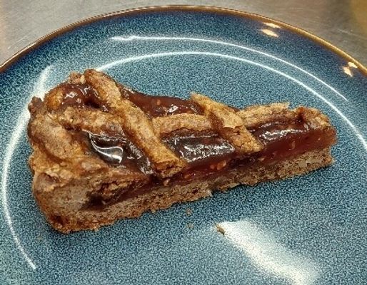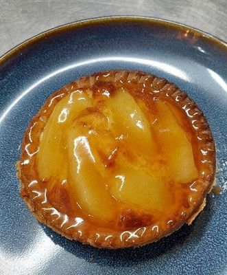 Pears on an almond meal filling, apricot glaze in a shortcrust case
